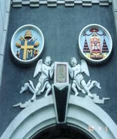 懸掛在面對聖殿大門頂的左側標誌教宗牧徽 現在依圖一一說明如下: 三層冠 兩把鑰匙 M字在十字架下